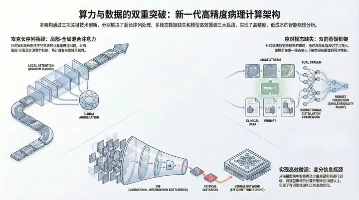 Image credit:The gigapixel scale of Whole Slide Images (WSI), the chronic absence of clinical multimodal data, and the “compute wall” for fine-tuning large models constitute the “Three Major Hurdles” restricting the development of high-precision pathological AI.